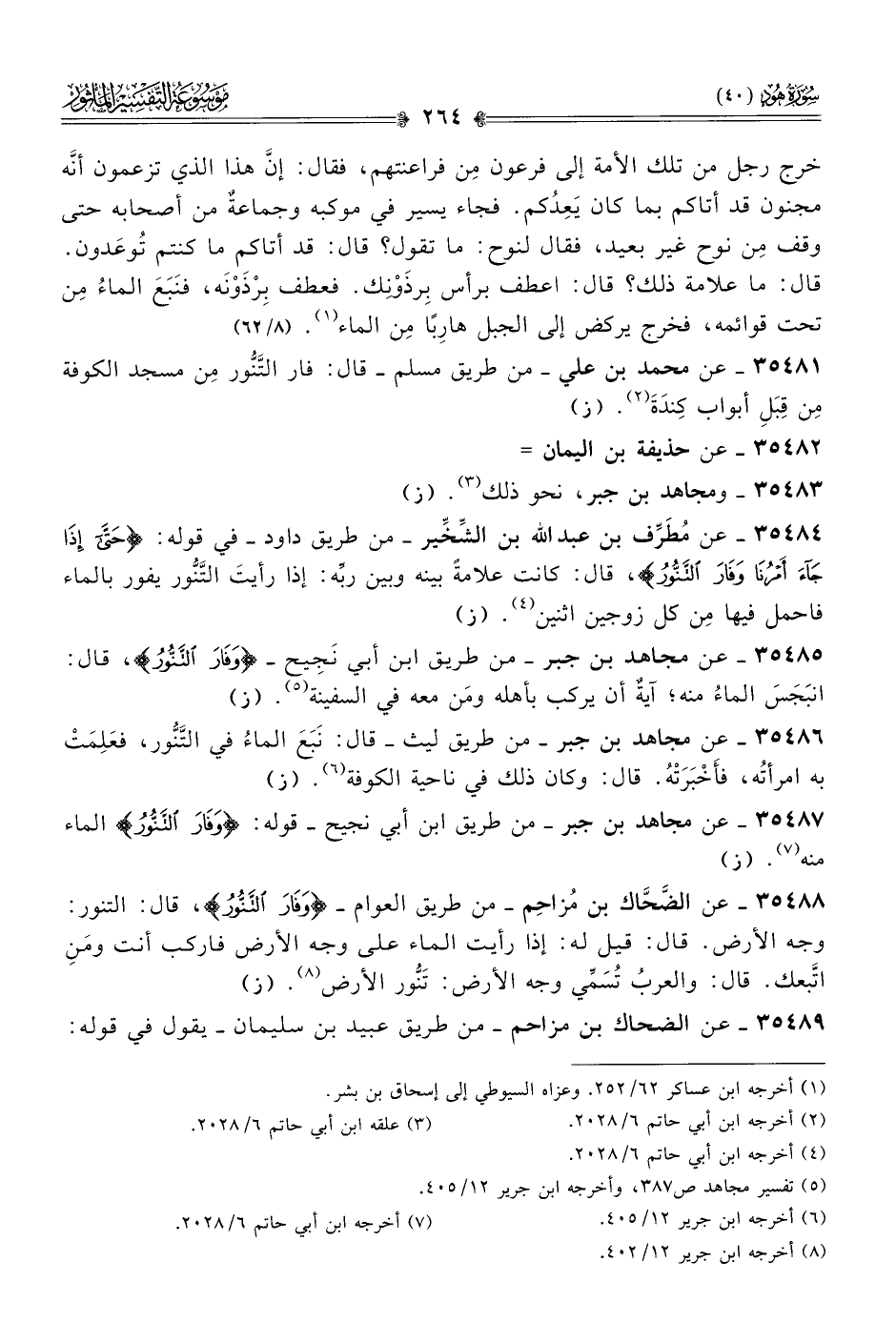 ٣٥٤٨٧ - عن مجاهد بن جبر -من طريق ابن أبي نجيح- قوله: {وفار التنور} الماء منه (¬٧). (ز)