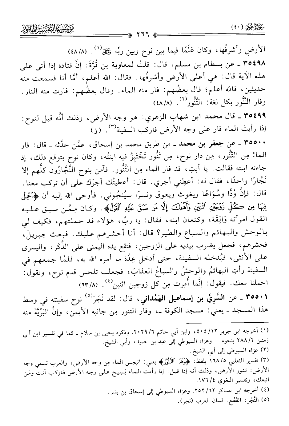 (¬٣) تفسير الثعلبي ٥/ ١٦٨ بلفظ: {وفار التنور} يعني: انبجس الماء مِن وجه الأرض، والعرب تسمي وجه الأرض: تنور الأرض، وذلك أنه إذا قيل: إذا رأيت الماء يَسِيح على وجه الأرض فاركب أنت ومَن اتبعك، وتفسير البغوي ٤/ ١٧٦.