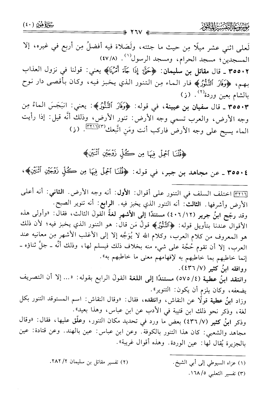 [٣٢١٦] اختلف السلف في التنور على أقوال: الأول: أنه وجه الأرض. الثاني: أنه أعلى الأرض وأشرفها. الثالث: أنه التنور الذي يخبز فيه. الرابع: أنه تنوير الصبح.