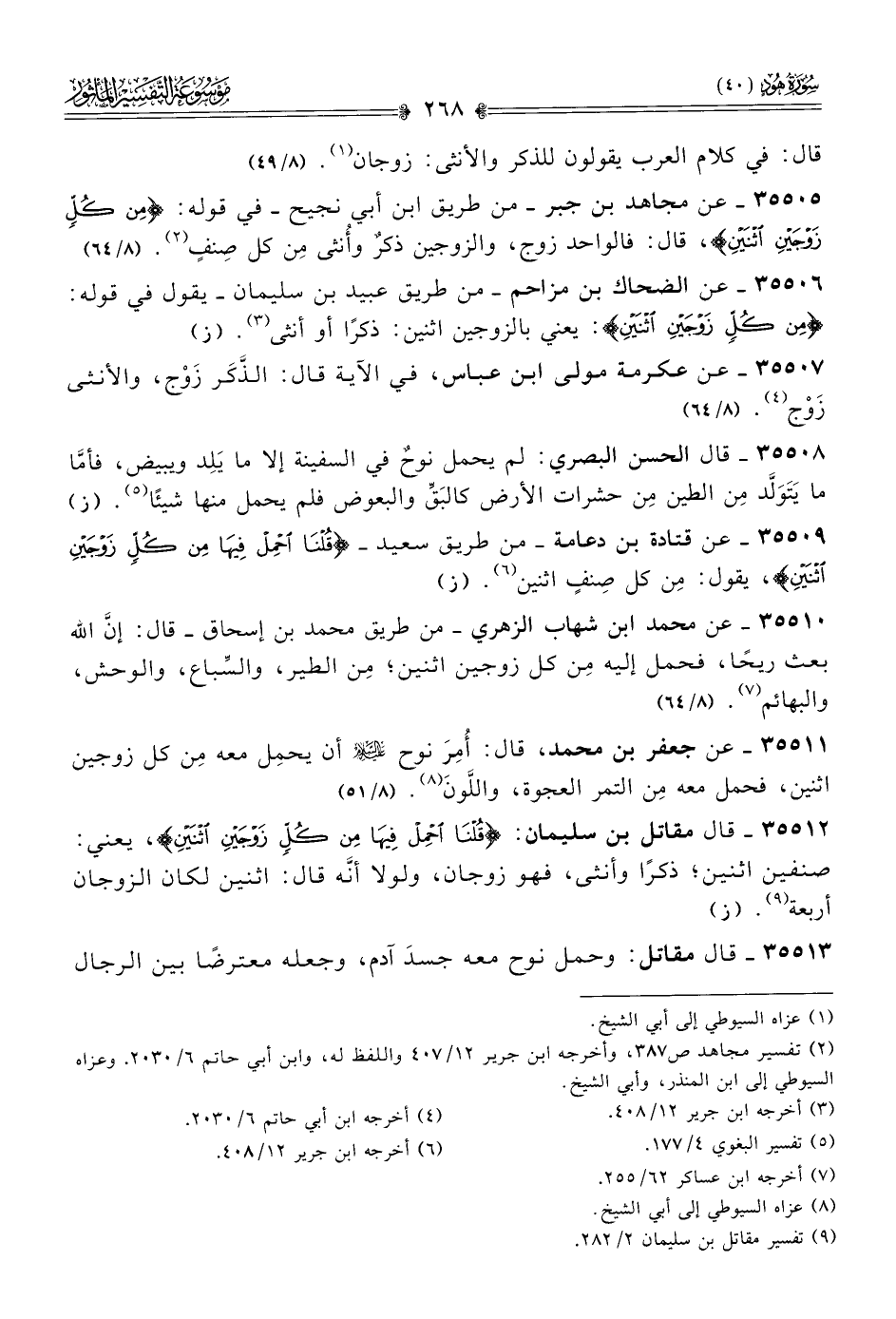 ٣٥٥٠٦ - عن الضحاك بن مزاحم -من طريق عبيد بن سليمان- يقول في قوله: {من كل زوجين اثنين}: يعني بالزوجين اثنين: ذكرًا أو أنثى (¬٣). (ز)