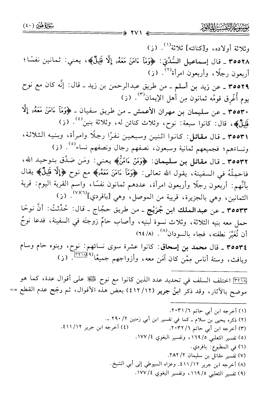 [٣٢١٨] اختلف السلف في تحديد عدد الذين كانوا مع نوح - عليه السلام - على أقوال عدة، كما هو موضح بالآثار، وقد ذكر ابنُ جرير (١٢/ ٤١٢) بعض هذه الأقوال، ثم رجّح عدم القطع بقول منها مستندًا لعدم وجود دليل يقطع لأحدها، فقال: «والصواب من القول في ذلك أن يُقال كما قال الله: {وما آمن معه إلا قليل}، يصفهم بأنهم كانوا قليلًا، ولم يحدد عددهم بمقدار، ولا خبر عن رسول الله - صلى الله عليه وسلم - صحيح، فلا ينبغي أن يتجاوز في ذلك حدَّ الله، إذ لم يكن لمبلغ عدد ذلك حد من كتاب الله أو أثر عن رسول الله - صلى الله عليه وسلم -».