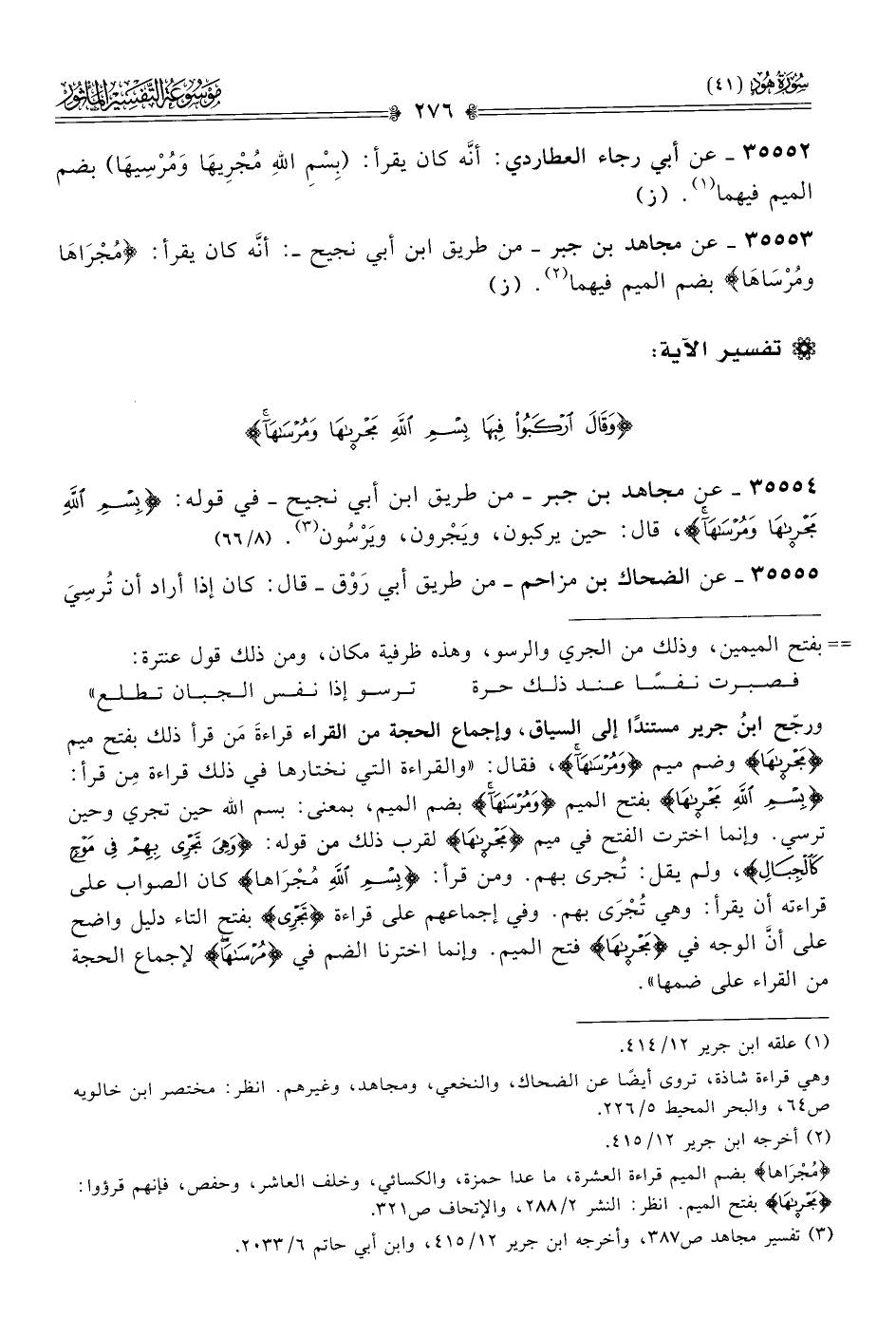 ٣٥٥٥٣ - عن مجاهد بن جبر -من طريق ابن أبي نجيح- أنّه كان يقرأ: «مُجْراها ومُرْساها» بضم الميم فيهما (¬٢). (ز)
