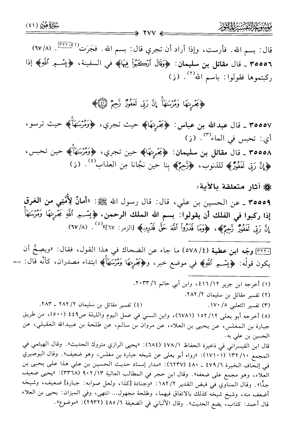 ٣٥٥٥٨ - قال مقاتل بن سليمان: {مَجْراها} حين تجري، {ومُرْساها} حين تحبس، {إنَّ رَبِّي لَغَفُورٌ} للذنوب، {رَحِيمٌ} بِنا حين نجّانا مِن العذاب (¬٤). (ز)