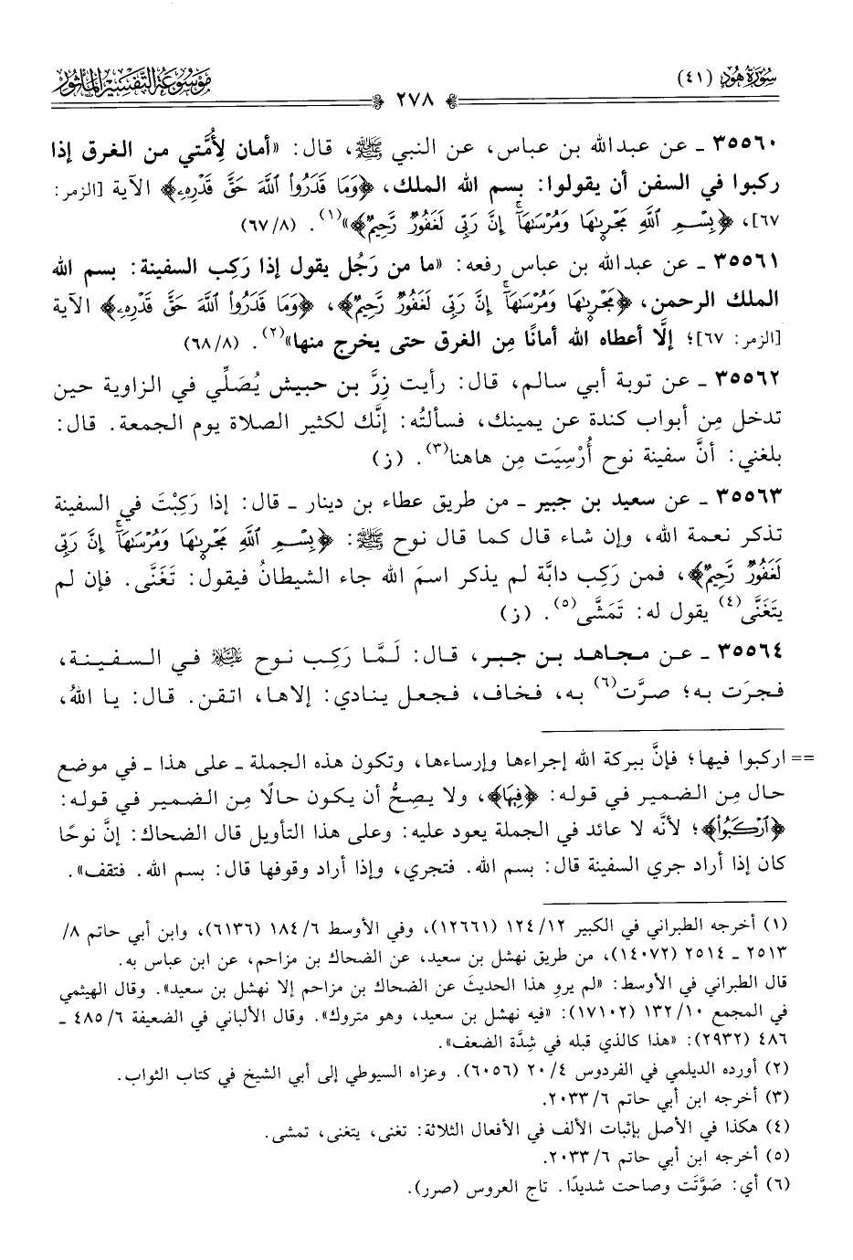 ٣٥٥٦١ - عن عبد الله بن عباس رفعه: «ما من رَجُل يقول إذا رَكِب السفينة: بسم الله الملك الرحمن، {مجراها ومرساها إن ربي لغفور رحيم}، {وما قدروا الله حق قدره} [الزمر: ٦٧]؛ إلّا أعطاه الله أمانًا مِن الغرق حتى يخرج منها» (¬٢). (٨/ ٦٧)