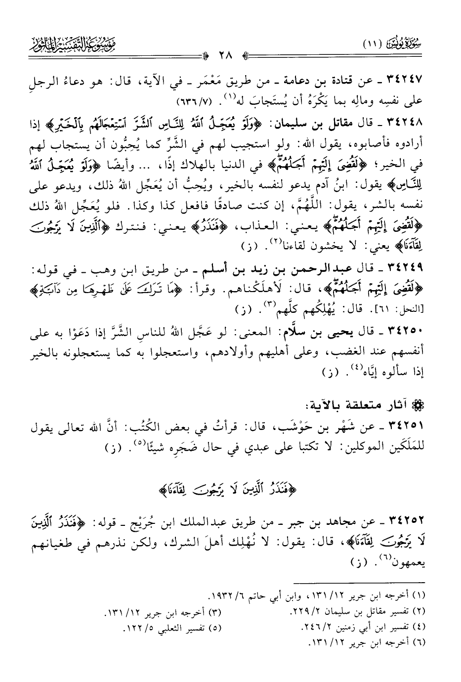 ٣٤٢٥٢ - عن مجاهد بن جبر -من طريق عبد الملك ابن جُرَيْج- قوله: {فنذر الذين لا يرجون لقاءنا}، قال: يقول: لا نُهْلِك أهلَ الشرك، ولكن نذرهم في طغيانهم يعمهون (¬٦). (ز)
