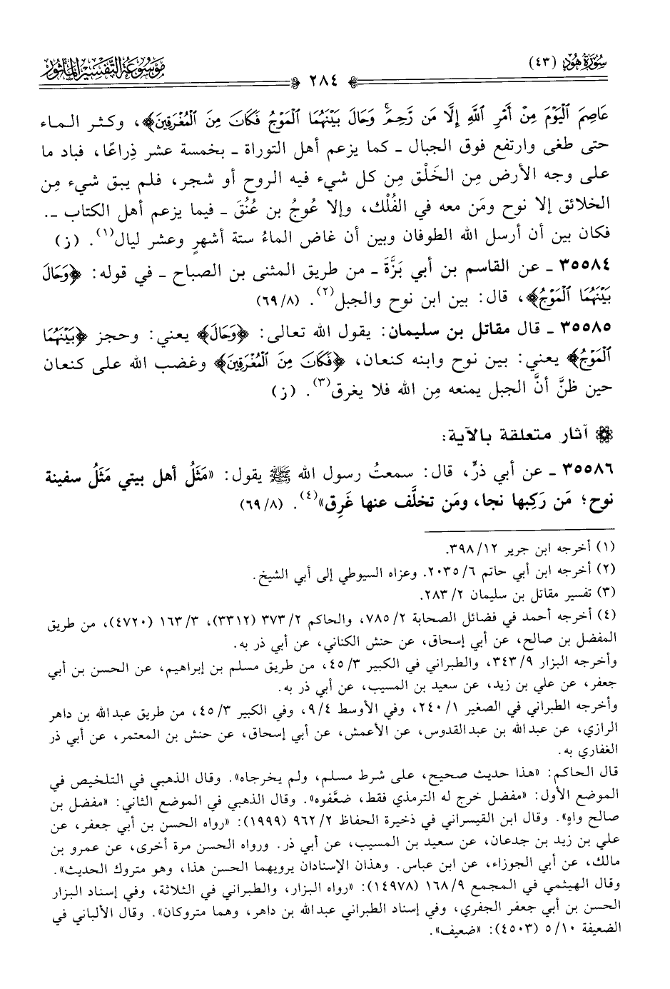 ٣٥٥٨٦ - عن أبي ذرٍّ، قال: سمعتُ رسول الله - صلى الله عليه وسلم - يقول: «مَثَلُ أهل بيتي مَثَلُ سفينة نوح؛ مَن رَكِبها نجا، ومَن تخلَّف عنها غَرِق» (¬٤). (٨/ ٦٩)