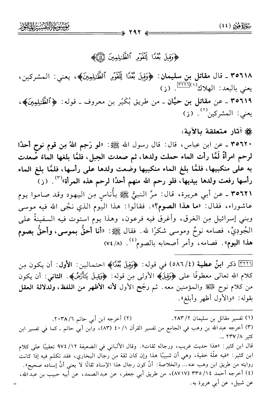 ٣٥٦٢١ - عن أبي هريرة، قال: مرَّ النبيُّ - صلى الله عليه وسلم - بأُناسٍ مِن اليهود وقد صاموا يوم عاشوراء، فقال: «ما هذا الصوم؟». فقالوا: هذا اليوم الذي نجّى الله فيه موسى وبني إسرائيل مِن الغرق، وأغرق فيه فرعون، وهذا يوم استوت فيه السفينةُ على الجُودِيِّ، فصامه نوحٌ وموسى شكرًا لله. فقال - صلى الله عليه وسلم -: «أنا أحقُّ بموسى، وأحقُّ بصوم هذا اليوم». فصامه، وأمر أصحابه بالصوم (¬٤). (٨/ ٧٤)