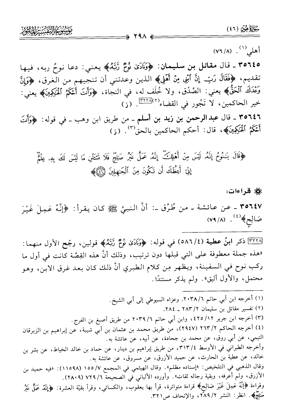 ٣٥٦٤٧ - عن عائشة -من طُرُق- أنّ النبيَّ - صلى الله عليه وسلم - كان يقرأ: «إنَّهُ عَمِلَ غَيْرَ صالِحٍ» (¬٤). (٨/ ٧٩)