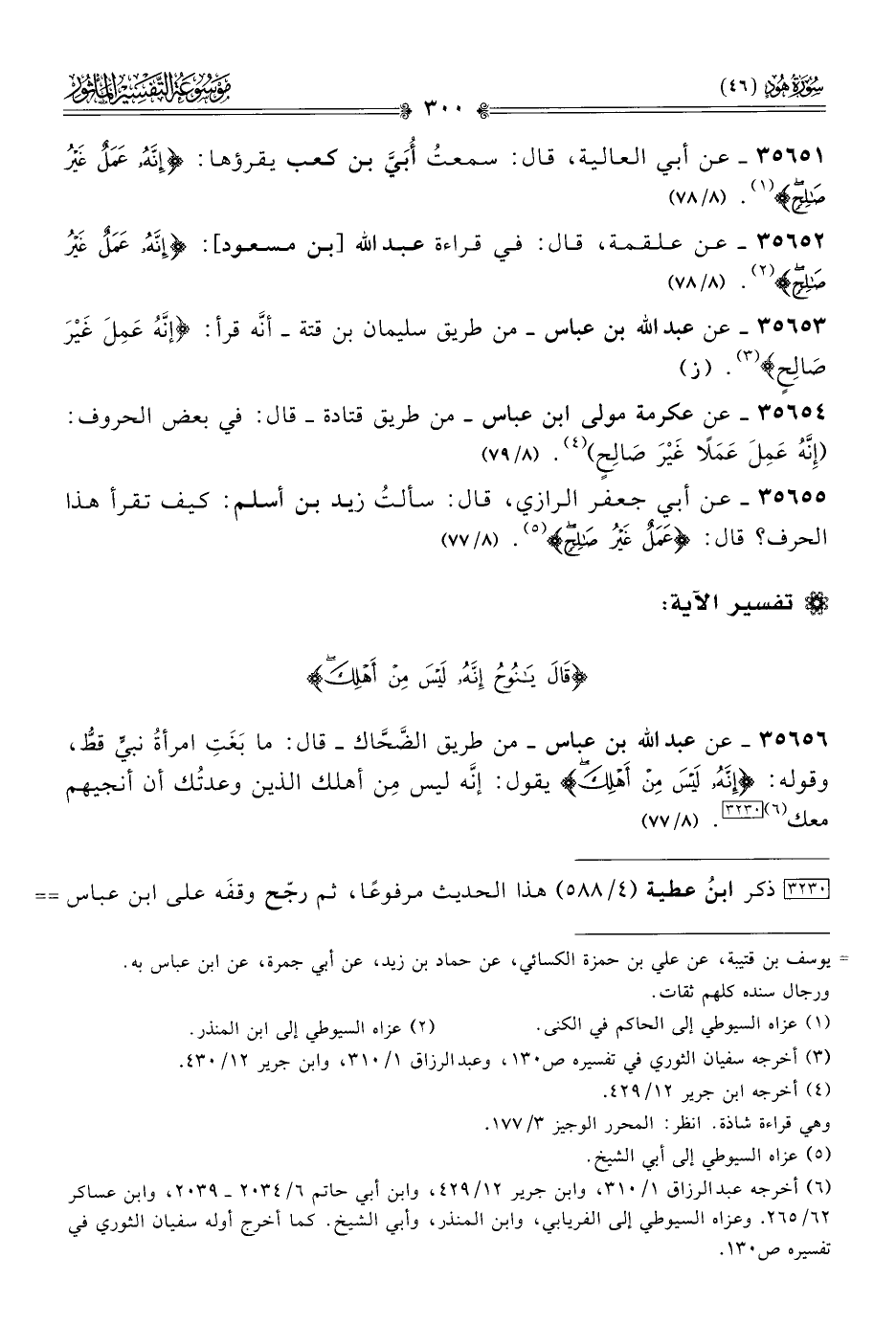 ٣٥٦٥١ - عن أبي العالية، قال: سمعتُ أُبَيَّ بن كعب يقرؤها: {إنَّهُ عَمَلٌ غَيْرُ صالِحٍ} (¬١). (٨/ ٧٨)
