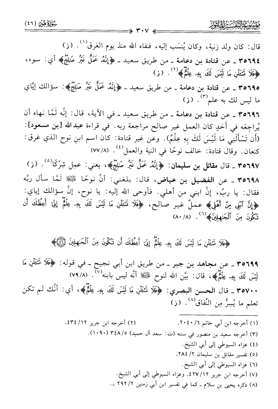 ٣٥٦٩٩ - عن مجاهد بن جبر -من طريق ابن أبي نجيح- في قوله: {فلا تسألن ما ليس لك به علم}، قال: بينَّ الله لنوح - عليه السلام - أنّه ليس بابنه (¬٧). (٨/ ٧٩)
