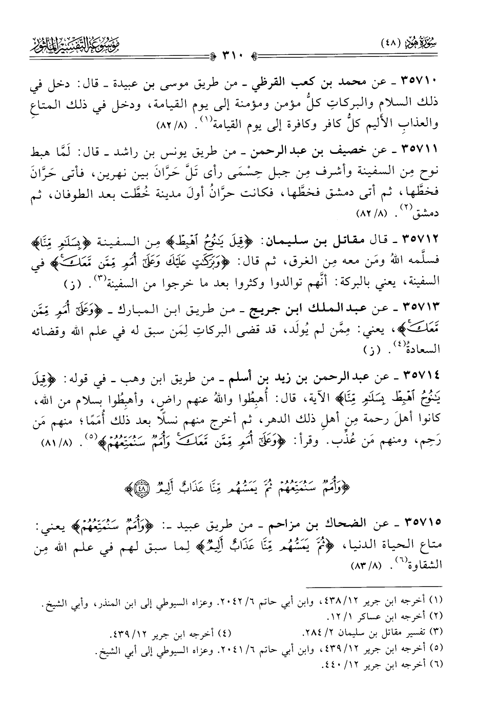 ٣٥٧١٤ - عن عبد الرحمن بن زيد بن أسلم -من طريق ابن وهب- في قوله: {قيل يا نوح اهبط بسلام منا} الآية، قال: أُهبِطُوا واللهُ عنهم راضٍ، وأهبِطُوا بسلام من الله، كانوا أهلَ رحمة مِن أهلِ ذلك الدهر، ثم أخرج منهم نسلًا بعد ذلك أُمَمًا؛ منهم مَن رَحِم، ومنهم مَن عُذِّب. وقرأ: {وعلى أمم ممن معك وأمم سنمتعهم} (¬٥). (٨/ ٨١)