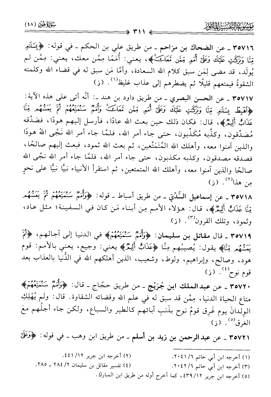 ٣٥٧١٨ - عن إسماعيل السُّدِّيّ -من طريق أسباط- قوله: {وأمم سنمتعهم ثم يمسهم منا عذاب أليم}، قال: هؤلاء الأمم مِن أبناء مَن كان في السفينة؛ مثل عاد، وثمود، وتلك القرون (¬٣). (ز)