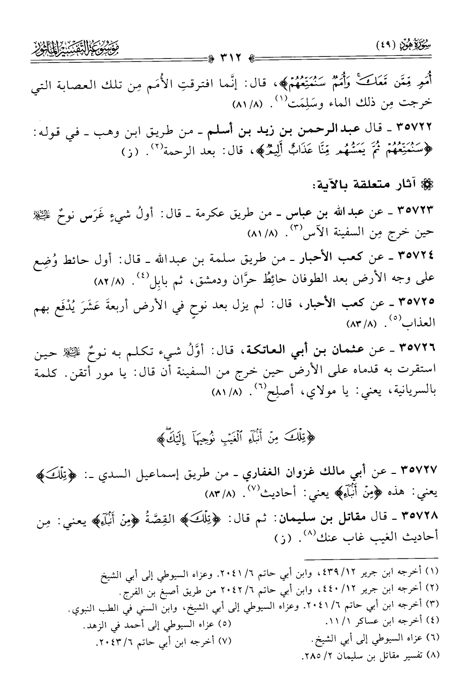 أمم ممن معك وأمم سنمتعهم}، قال: إنّما افترقتِ الأُمَم مِن تلك العصابة التي خرجت مِن ذلك الماء وسَلِمَت (¬١). (٨/ ٨١)