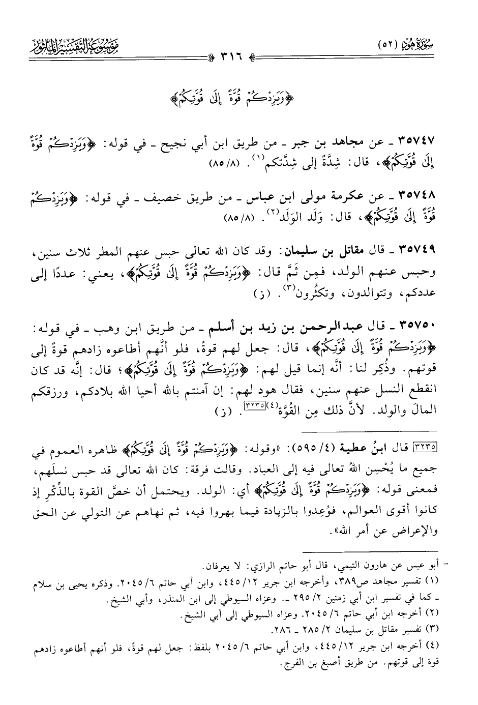 ٣٥٧٤٩ - قال مقاتل بن سليمان: وقد كان الله تعالى حبس عنهم المطر ثلاث سنين، وحبس عنهم الولد، فمِن ثَمَّ قال: {ويَزِدْكُمْ قُوَّةً إلى قُوَّتِكُمْ}، يعني: عددًا إلى عددكم، وتتوالدون، وتكثُرون (¬٣). (ز)