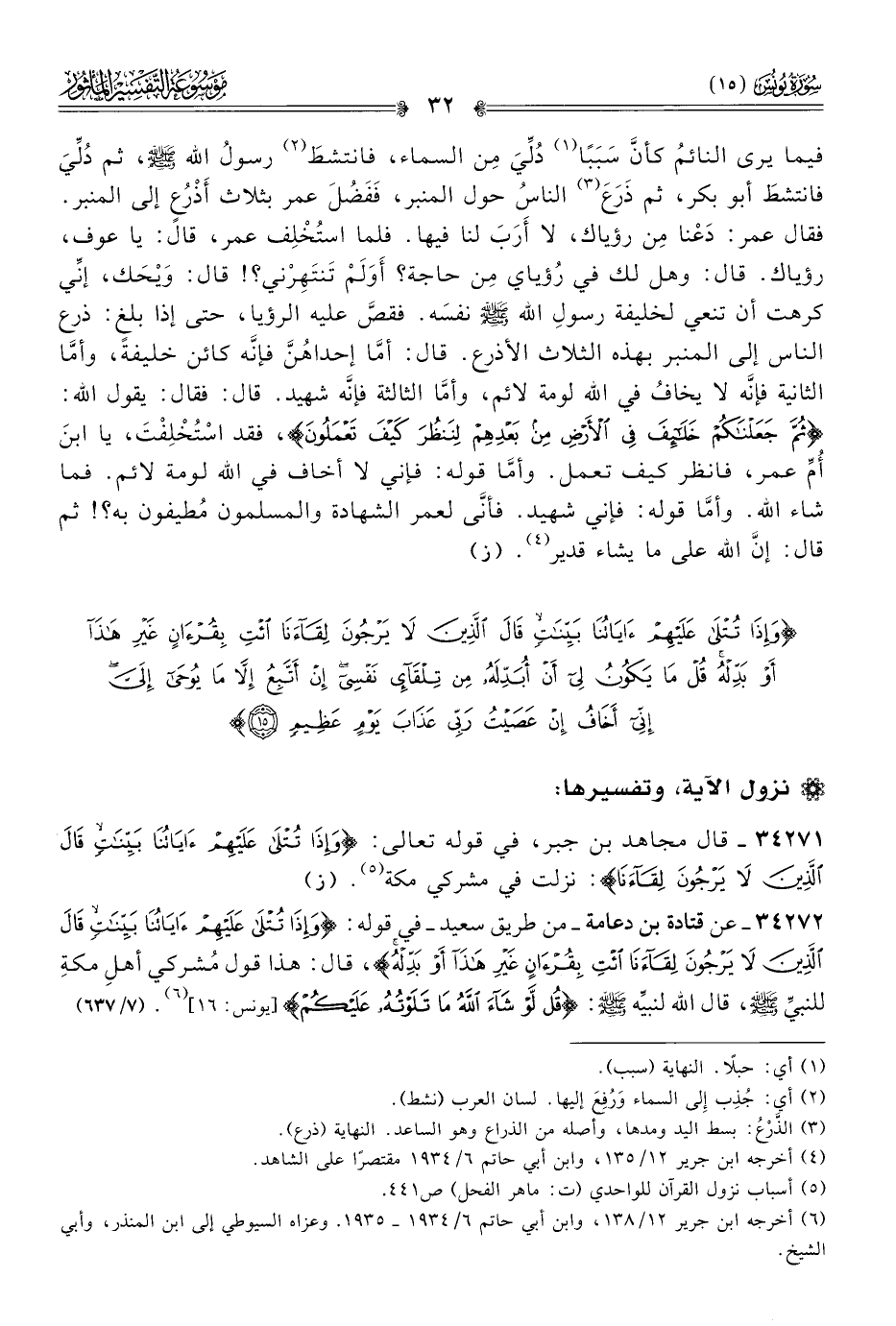 فيما يرى النائمُ كأنّ سَبَبًا (¬١) دُلِّيَ مِن السماء، فانتشطَ (¬٢) رسولُ الله - صلى الله عليه وسلم -، ثم دُلِّيَ فانتشطَ أبو بكر، ثم ذَرَعَ (¬٣) الناسُ حول المنبر، فَفَضُلَ عمر بثلاث أذْرُعٍ إلى المنبر. فقال عمر: دَعْنا مِن رؤياك، لا أرَبَ لنا فيها. فلما استُخْلِف عمر، قال: يا عوف، رؤياك. قال: وهل لك في رُؤياي مِن حاجة؟ أوَلَمْ تَنتَهِرْني؟! قال: ويْحَك، إنِّي كرهت أن تنعي لخليفة رسولِ الله - صلى الله عليه وسلم - نفسَه. فقصَّ عليه الرؤيا، حتى إذا بلغ: ذرع الناس إلى المنبر بهذه الثلاث الأذرع. قال: أمّا إحداهُنَّ فإنّه كائن خليفةً، وأمّا الثانية فإنّه لا يخافُ في الله لومة لائم، وأمّا الثالثة فإنّه شهيد. قال: فقال: يقول الله: {ثُمَّ جَعَلْناكُمْ خَلائِفَ فِي الأَرْضِ مِن بَعْدِهِمْ لِنَنْظُرَ كَيْفَ تَعْمَلُونَ}، فقد اسْتُخْلِفْتَ، يا ابنَ أُمِّ عمر، فانظر كيف تعمل. وأمّا قوله: فإني لا أخاف في الله لومة لائم. فما شاء الله. وأمّا قوله: فإني شهيد. فأنّى لعمر الشهادة والمسلمون مُطيفون به؟! ثم قال: إنّ الله على ما يشاء قدير (¬٤). (ز)