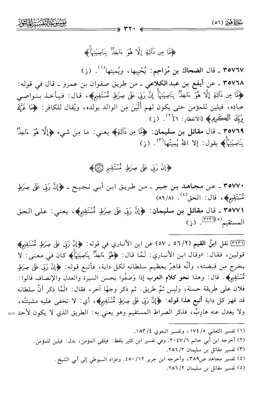 [٣٢٣٦] نقل ابنُ القيم (٢/ ٥٦ - ٥٧) عن ابن الأنباري في قوله: {إن ربي على صراط مستقيم} قولين، فقال: «وقال ابن الأنباري: لَمّا قال: {هُوَ آخِذٌ بِناصِيَتِها} كان في معنى: لا يخرج مِن قبضته، وأنّه قاهِرٌ بعظيم سلطانه لكل دابة، فأتبع قوله: {إنَّ رَبِّي عَلى صِراطٍ مُسْتَقِيمٍ}. قال: وهذا نحو كلام العرب إذا وصَفُوا بحسن السيرة والعدل والإنصاف قالوا: فلان على طريقة حسنة، وليس ثمَّ طريق. ثم ذكر وجهًا آخر، فقال:» لَمّا ذكر أنّ سلطانه قد قهر كل دابة أتبع هذا قوله: {إنَّ رَبِّي عَلى صِراطٍ مُسْتَقِيمٍ}، أي: لا تخفى عليه مشيئتُه، ولا يعدل عنه هارِبٌ، فذكر الصراط المستقيم وهو يعني به: الطريق الذي لا يكون لأحد مسلك إلا عليه، كما قال: {إنَّ رَبَّكَ لَبِالمِرْصادِ} [الفجر: ١٤] «. ثم وجّه ابنُ القيم معنى الآية على القولين، فقال:» فعلى هذا القول الأول يكون المراد: أنّه في تصرُّفه في ملكه يتصرَّف بالعدل، ومجازاة المحسن بإحسانه والمسيء بإساءته، ولا يظلم مثقال ذرة، ولا يُعاقِب أحدًا بما لم يَجْنِه، ولا يهضمه ثوابَ ما عمله، ولا يحمل عليه ذنبَ غيره، ولا يأخذ أحدًا بجريرة أحد، ولا يُكَلِّف نفسًا ما لا تطيقه، فيكون من باب: له الملك وله الحمد، ومن باب: ماضٍ فِيَّ حُكْمُك عدلٌ فِيَّ قضاؤك، ومن باب: الحمد لله رب العالمين، أي: كما أنّه رب العالمين المتصرف فيهم بقدرته ومشيئته فهو المحمود على هذا التصرف، وله الحمد على جميعه. وعلى القول الثاني المراد به: التهديد والوعيد، وأنّ مصير العباد إليه، وطريقهم عليه، لا يفوته منهم أحد، كما قال تعالى: {قالَ هَذا صِراطٌ عَلَيَّ مُسْتَقِيمٌ} [الحجر: ٤١] ".