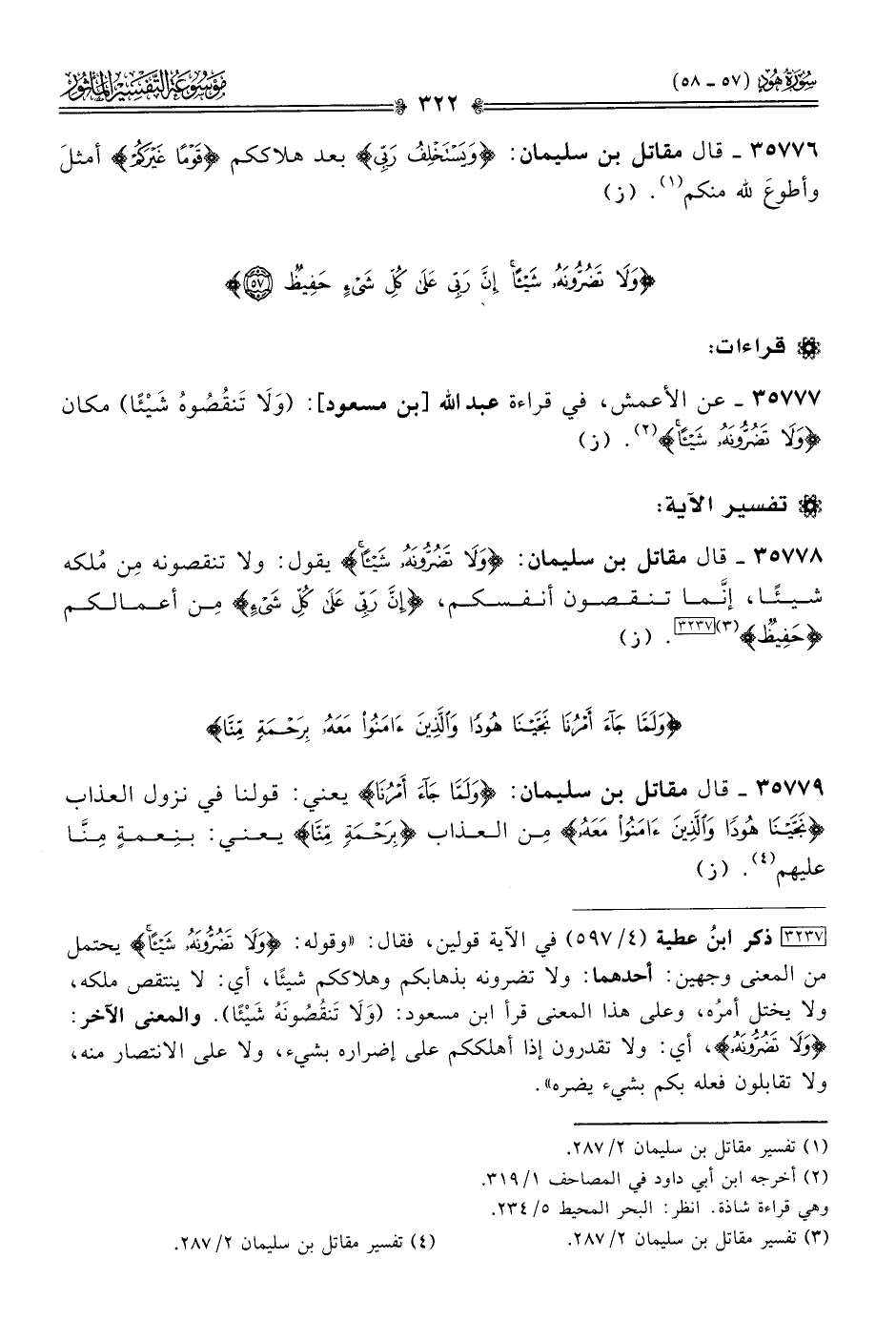 [٣٢٣٧] ذكر ابنُ عطية (٤/ ٥٩٧) في الآية قولين، فقال: «وقوله: {ولا تَضُرُّونَهُ شَيْئًا} يحتمل من المعنى وجهين: أحدهما: ولا تضرونه بذهابكم وهلاككم شيئًا، أي: لا ينتقص ملكه، ولا يختل أمرُه، وعلى هذا المعنى قرأ ابن مسعود: (ولا تَنقُصُونَهُ شَيْئًا». والمعنى الآخر: {ولا تَضُرُّونَهُ} أي ولا تقدرون إذا أهلككم على إضراره بشيء، ولا على الانتصار منه، ولا تقابلون فعله بكم بشيء يضره".