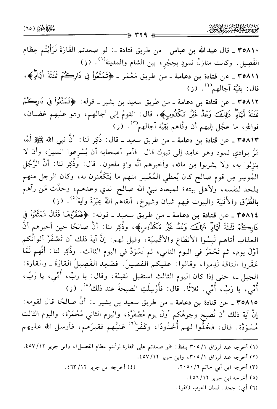 ٣٥٨١٠ - قال عبد الله بن عباس -من طريق قتادة-: لو صعدتم القارَةَ لَرَأَيْتُم عِظام الفَصِيل. وكانت منازلُ ثمودٍ بحِجْرٍ، بين الشام والمدينة (¬١). (ز)