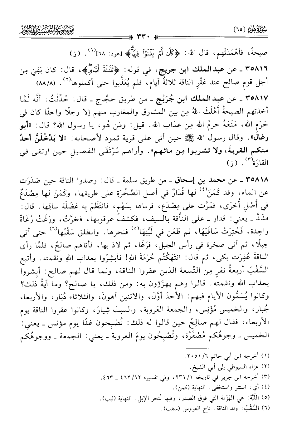 ٣٥٨١٦ - عن عبد الملك ابن جريج، في قوله: {ثلاثة أيام}، قال: كان بَقِيَ مِن أجل قومِ صالح عند عَقْرِ الناقة ثلاثةُ أيام، فلم يُعَذَّبوا حتى أكملوها (¬٢). (٨/ ٨٨)