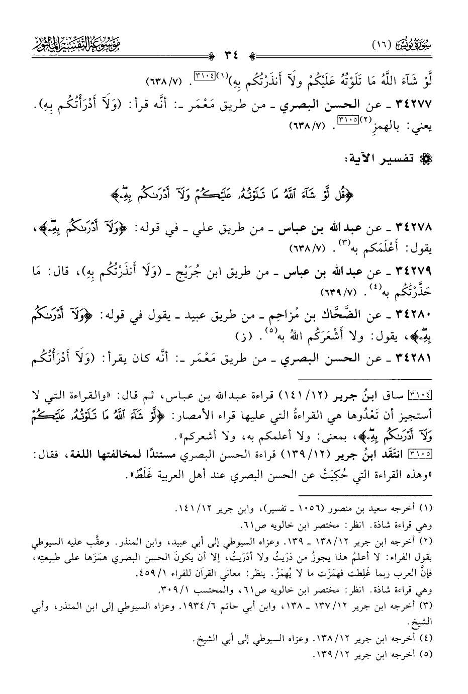 ٣٤٢٧٧ - عن الحسن البصري -من طريق مَعْمَر- أنّه قرأ: (ولَآ أدْرَأْتُكُم بِهِ). يعني: بالهمزِ (¬٢) [٣١٠٥]. (٧/ ٦٣٨)