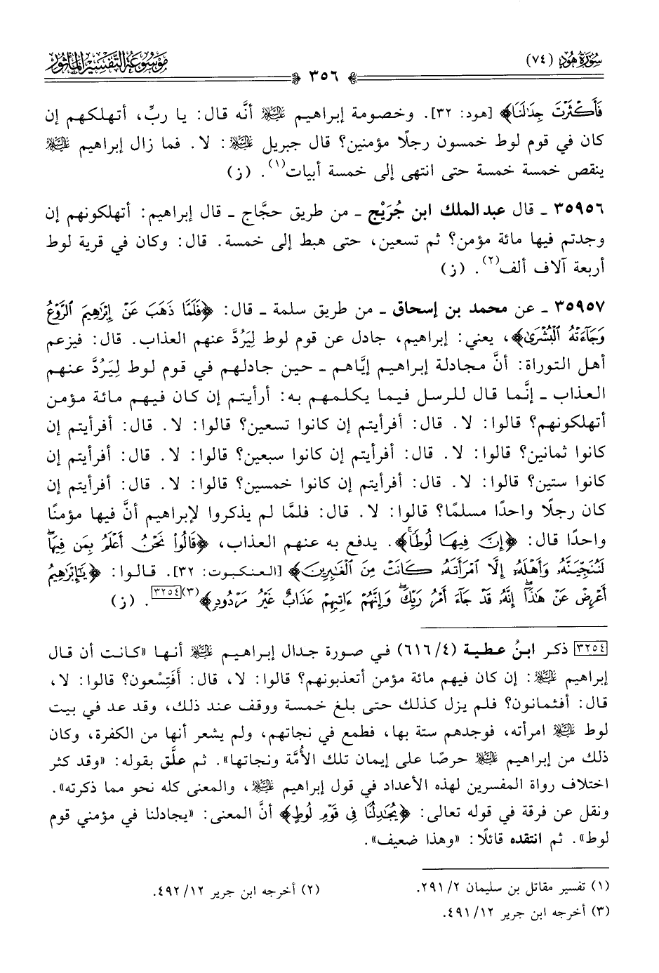 ٣٥٩٥٦ - قال عبد الملك ابن جُرَيْج -من طريق حجّاج- قال إبراهيم: أتهلكونهم إن وجدتم فيها مائة مؤمن؟ ثم تسعين، حتى هبط إلى خمسة. قال: وكان في قرية لوط أربعة آلاف ألف (¬٢). (ز)