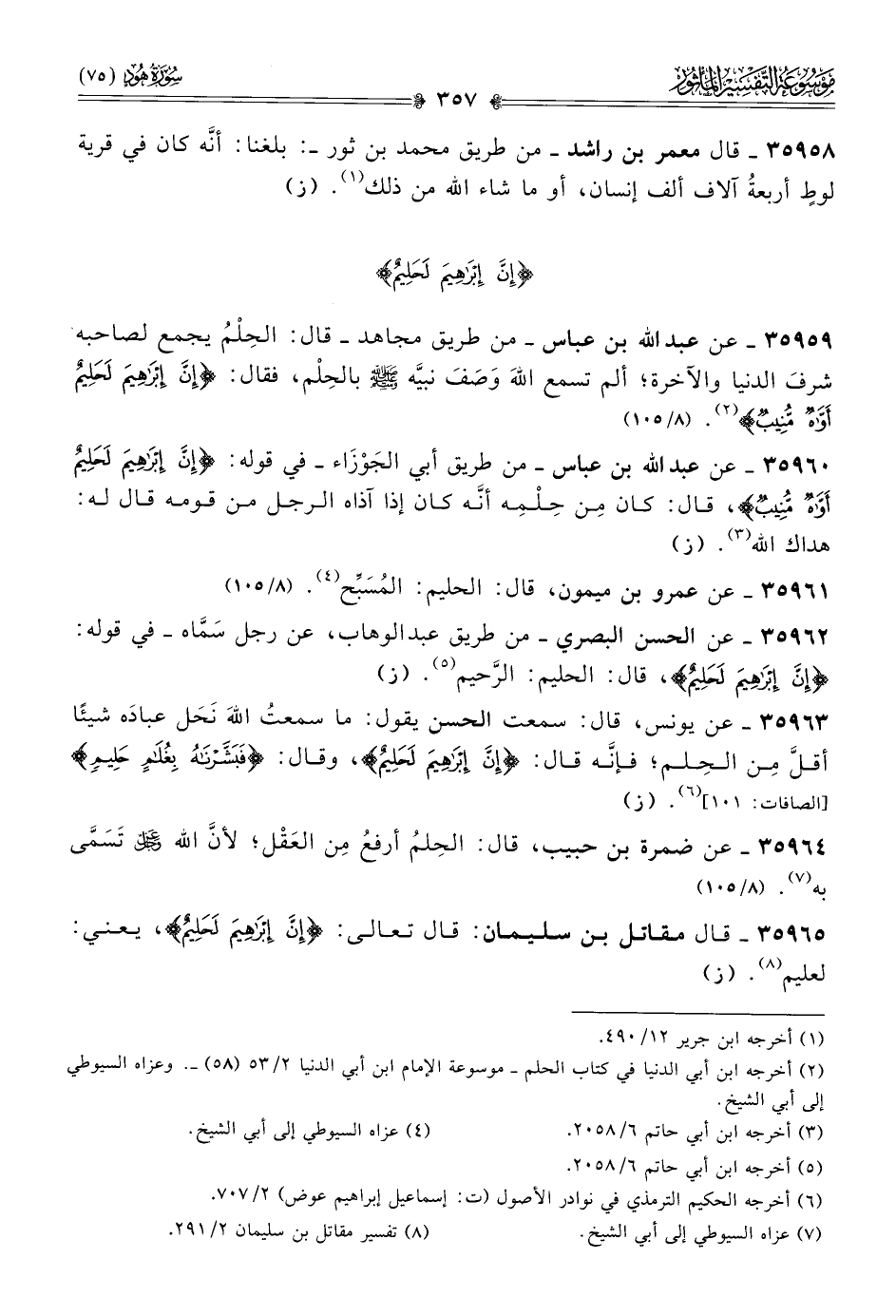 ٣٥٩٦٥ - قال مقاتل بن سليمان: قال تعالى: {إنَّ إبْراهِيمَ لَحَلِيمٌ}، يعني: لعليم (¬٨). (ز)