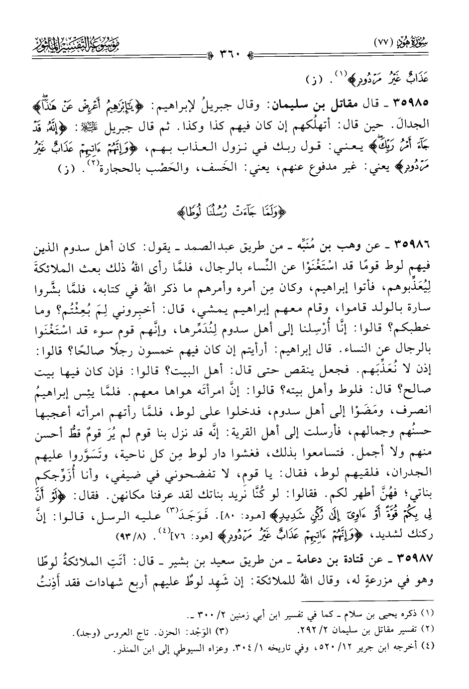٣٥٩٨٦ - عن وهب بن مُنَبِّه -من طريق عبد الصمد- يقول: كان أهل سدوم الذين فيهم لوط قومًا قد اسْتَغْنَوْا عن النِّساء بالرجال، فلمّا رأى اللهُ ذلك بعث الملائكةَ لِيُعَذِّبوهم، فأتوا إبراهيم، وكان مِن أمره وأمرهم ما ذكر اللهُ في كتابه، فلمّا بشَّروا سارة بالولد قاموا، وقام معهم إبراهيم يمشي، قال: أخبِروني لِمَ بُعِثْتُم؟ وما خطبكم؟ قالوا: إنّا أُرْسِلنا إلى أهل سدوم لِنُدَمِّرها، وإنّهم قوم سوء قد اسْتَغْنَوا بالرجال عن النساء. قال إبراهيم: أرأيتم إن كان فيهم خمسون رجلًا صالحًا؟ قالوا: إذن لا نُعَذِّبَهم. فجعل ينقص حتى قال: أهل البيت؟ قالوا: فإن كان فيها بيت صالح؟ قال: فلوط وأهل بيته؟ قالوا: إنّ امرأتَه هواها معهم. فلمّا يئِس إبراهيمُ انصرف، ومَضَوْا إلى أهل سدوم، فدخلوا على لوط، فلمّا رأتهم امرأته أعجبها حسنُهم وجمالهم، فأرسلت إلى أهل القرية: إنّه قد نزل بنا قوم لم يُرَ قومٌ قطُّ أحسن منهم ولا أجمل. فتسامعوا بذلك، فغشوا دار لوط مِن كل ناحية، وتَسَوَّروا عليهم الجدران، فلقيهم لوط، فقال: يا قومِ، لا تفضحوني في ضيفي، وأنا أُزَوِّجكم بناتي؛ فهُنَّ أطهر لكم. فقالوا: لو كُنّا نريد بناتك لقد عرفنا مكانهن. فقال: {لو أن لي بكم قوة أو آوي إلى ركن شديد}. فَوَجَدَ (¬٣) عليه الرسل، قالوا: إنّ ركنك لشديد، {وإنهم آتيهم عذاب غير مردود} (¬٤). (٨/ ٩٣)
