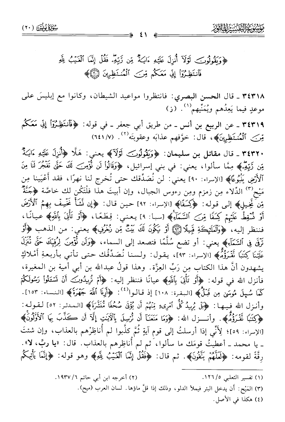 ٣٤٣٢٠ - قال مقاتل بن سليمان: {ويَقُولُونَ لَوْلا} يعني: هَلّا {أُنْزِلَ عَلَيْهِ آيَةٌ مِن رَبِّهِ} مِمّا سألوا، يعني: في بني إسرائيل، {وقالُوا لَنْ نُؤْمِنَ لَكَ حَتّى تَفْجُرَ لَنا مِنَ الأَرْضِ يَنْبُوعًا} [الإسراء: ٩٠] يعني: لن نُصَدِّقك حتى تُخرج لنا نهرًا، فقد أعْيَينا مِن مَيْحِ (¬٣) الدِّلاء مِن زمزم ومِن رءوس الجبال، وإن أبيتَ هذا فلْتَكُن لك خاصَّة {جَنَّةٌ مِن نَخِيلٍ} إلى قوله: {كِسَفًا} حين قال: {إنْ نَشَأْ نَخْسِفْ بِهِمُ الأَرْضَ أوْ نُسْقِطْ عَلَيْهِمْ كِسَفًا مِنَ السَّماءِ} [سبأ: ٩] يعني: قِطَعًا، {أوْ تَأْتِيَ بِاللَّهِ} عيانًا، فننظر إليه، {والمَلائِكَةِ قَبِيلًا أوْ يَكُونَ لَكَ بَيْتٌ مِن زُخْرُفٍ} يعني: من الذهب {أوْ تَرْقى فِي السَّماءِ} يعني: أو تضع سُلَّمًا فتصعد إلى السماء، {ولَنْ نُؤْمِنَ لِرُقِيِّكَ حَتّى تُنَزِّلَ عَلَيْنا كِتابًا نَقْرَؤُهُ} [الإسراء: ٩٣]، يقول: ولسنا نُصَدِّقُك حتى تأتي بأربعةِ أمْلاكٍ يشهدون أنّ هذا الكتاب مِن رَبِّ العِزَّة. وهذا قولُ عبد الله بن أبي أمية بن المغيرة، فأنزل الله في قوله: {أوْ تَأْتِيَ بِاللَّهِ} عيانًا فننظر إليه: {أمْ تُرِيدُونَ أنْ تَسْئَلُوا رَسُولَكُمْ كَما سُئِلَ مُوسى مِن قَبْلُ} إذ قالوا (¬٤) {أرِنا اللَّهَ جَهْرَةً} [البقرة: ١٠٨]. وأنزل الله فيها: {بَلْ يُرِيدُ كُلُّ امْرِئٍ مِنهُمْ أنْ يُؤْتى صُحُفًا مُنَشَّرَةً} [المدثر: ٥٢] لقوله: {كِتابًا نَقْرَؤُهُ}. وأنزل الله: {وما مَنَعَنا أنْ نُرْسِلَ بِالآياتِ إلّا أنْ كَذَّبَ بِها الأَوَّلُونَ} [الإسراء: ٥٩]؛ لِأَنِّي إذا أرسلتُ إلى قومِ آيةٍ ثُمَّ كذَّبوا لم أُناظِرْهم بالعذاب، وإن شئتَ -يا محمد- أعطيتُ قومَك ما سألوا، ثم لم أُناظِرهم بالعذاب. قال: «يا ربِّ، لا». رِقَّةً لقومه: {لَعَلَهُم يَتَّقُونَ}. ثم قال: {فَقُلْ إنَّما الغَيْبُ لِلَّهِ} وهو قوله: {إنَّما يَأْتِيكُمْ