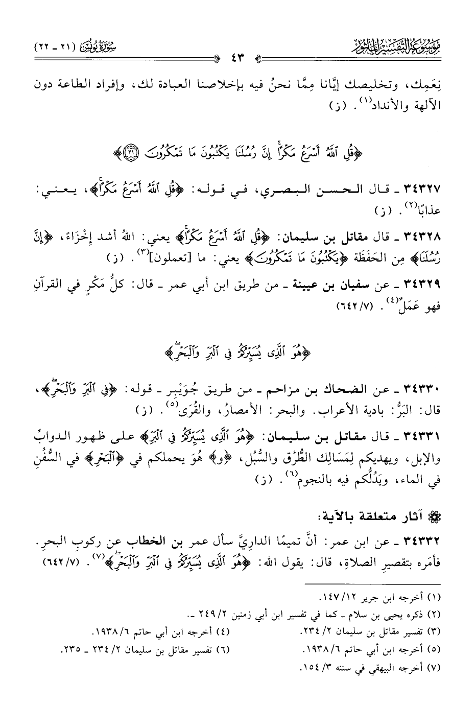 ٣٤٣٣١ - قال مقاتل بن سليمان: {هُوَ الَّذِي يُسَيِّرُكُمْ فِي البَرِّ} على ظهور الدوابِّ والإبل، ويهديكم لِمَسالِك الطُّرُق والسُّبُل، {و} هُوَ يحملكم في {البَحْرِ} في السُّفُنِ في الماء، ويَدُلُّكم فيه بالنجوم (¬٦). (ز)