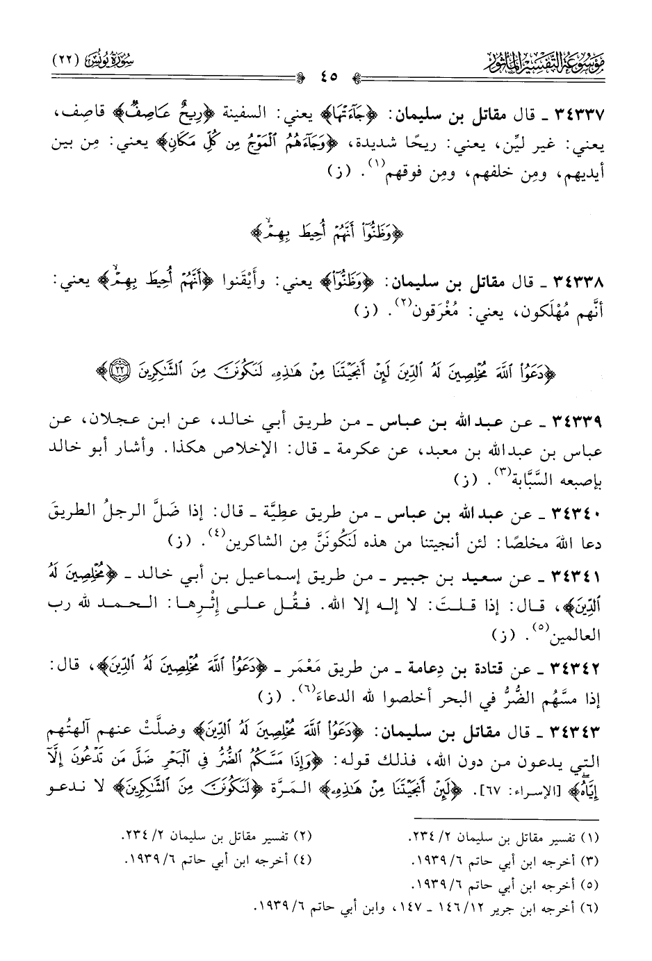 ٣٤٣٤٣ - قال مقاتل بن سليمان: {دَعَوُا اللَّهَ مُخْلِصِينَ لَهُ الدِّينَ} وضلَّتْ عنهم آلهتُهم التي يدعون من دون الله، فذلك قوله: {وإذا مَسَّكُمُ الضُّرُّ فِي البَحْرِ ضَلَّ مَن تَدْعُونَ إلّا إيّاهُ} [الإسراء: ٦٧]. {لَئِنْ أنْجَيْتَنا مِن هذِهِ} المَرَّة {لَنَكُونَنَّ مِنَ الشّاكِرِينَ} لا ندعو