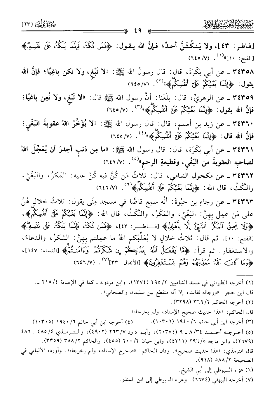٣٤٣٦٠ - عن زيد بن أسلم، قال: قال رسول الله - صلى الله عليه وسلم -: «لا يُؤَخِّرُ اللهُ عقوبةَ البَغْيِ؛ فإنّ الله قال: {إنَّما بَغيُكُمْ عَلى أنفُسِكُم}» (¬٤). (٧/ ٦٤٥)