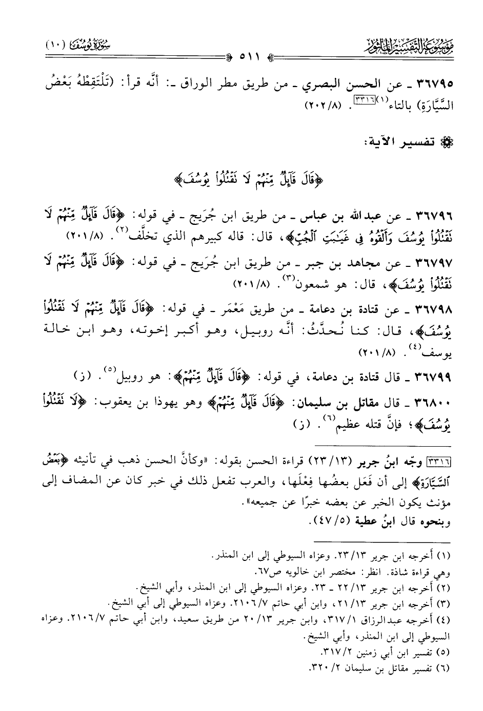 ٣٦٧٩٥ - عن الحسن البصري -من طريق مطر الوراق- أنّه قرأ: (تَلْتَقِطْهُ بَعْضُ السَّيّارَةِ) بالتاء (¬١) [٣٣١٦]. (٨/ ٢٠٢)