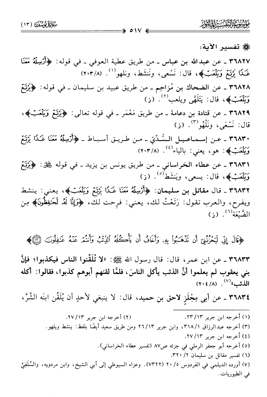 (¬٣) أخرجه عبد الرزاق ١/ ٣١٨، وابن جرير ١٣/ ٢٦ ومن طريق سعيد أيضًا بلفظ: ينشط ويلهو.