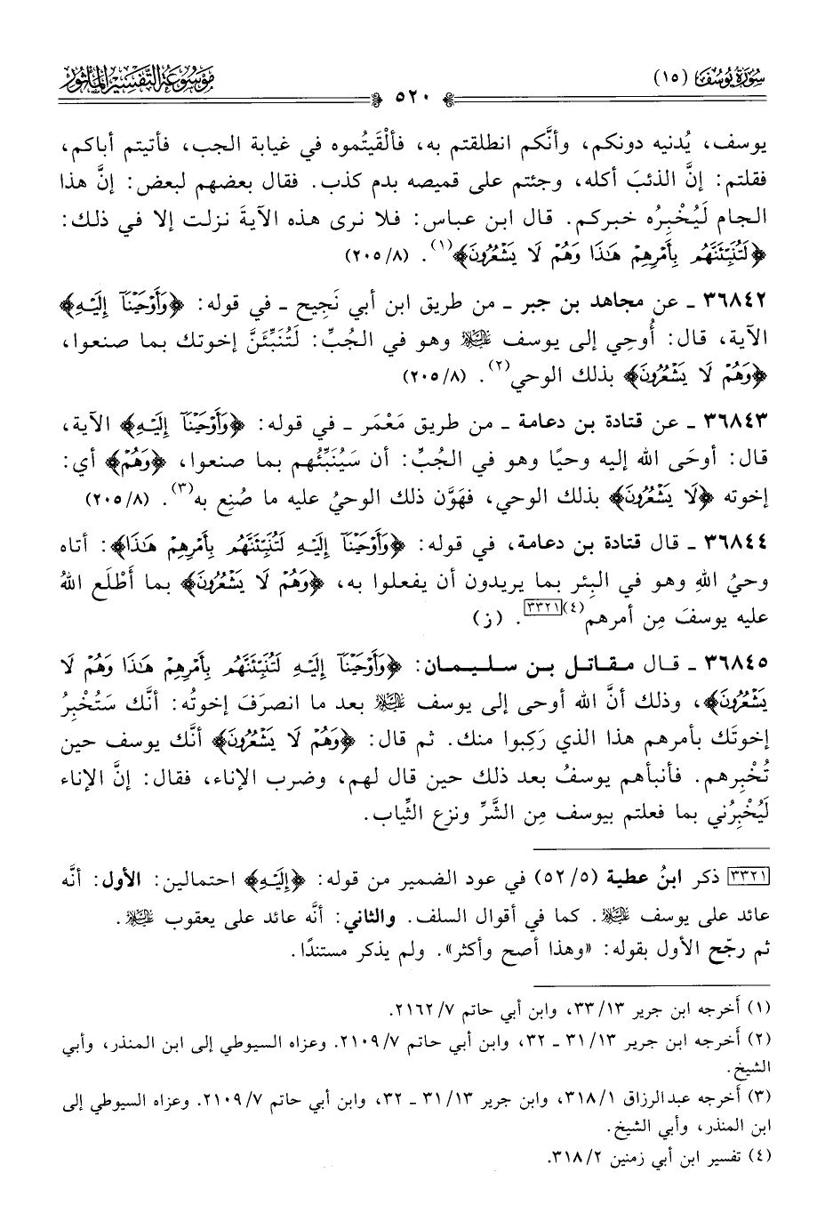 ٣٦٨٤٣ - عن قتادة بن دعامة -من طريق مَعْمَر- في قوله: {وأوحينا إليه} الآية، قال: أوحى الله إليه وحيًا وهو في الجُبِّ: أن سَيُنَبِّئُهم بما صنعوا، {وهم} أي: إخوته {لا يشعرون} بذلك الوحي، فهَوَّن ذلك الوحيُ عليه ما صُنِع به (¬٣). (٨/ ٢٠٥)