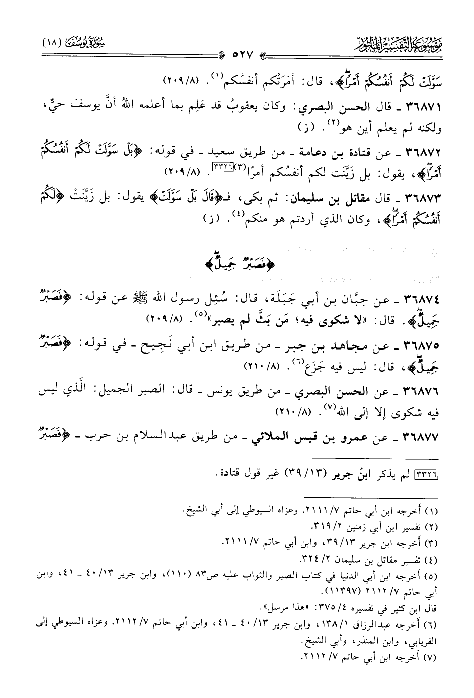 ٣٦٨٧٦ - عن الحسن البصري -من طريق يونس- قال: الصبر الجميل: الَّذي ليس فيه شكوى إلا إلى الله (¬٧). (٨/ ٢١٠)