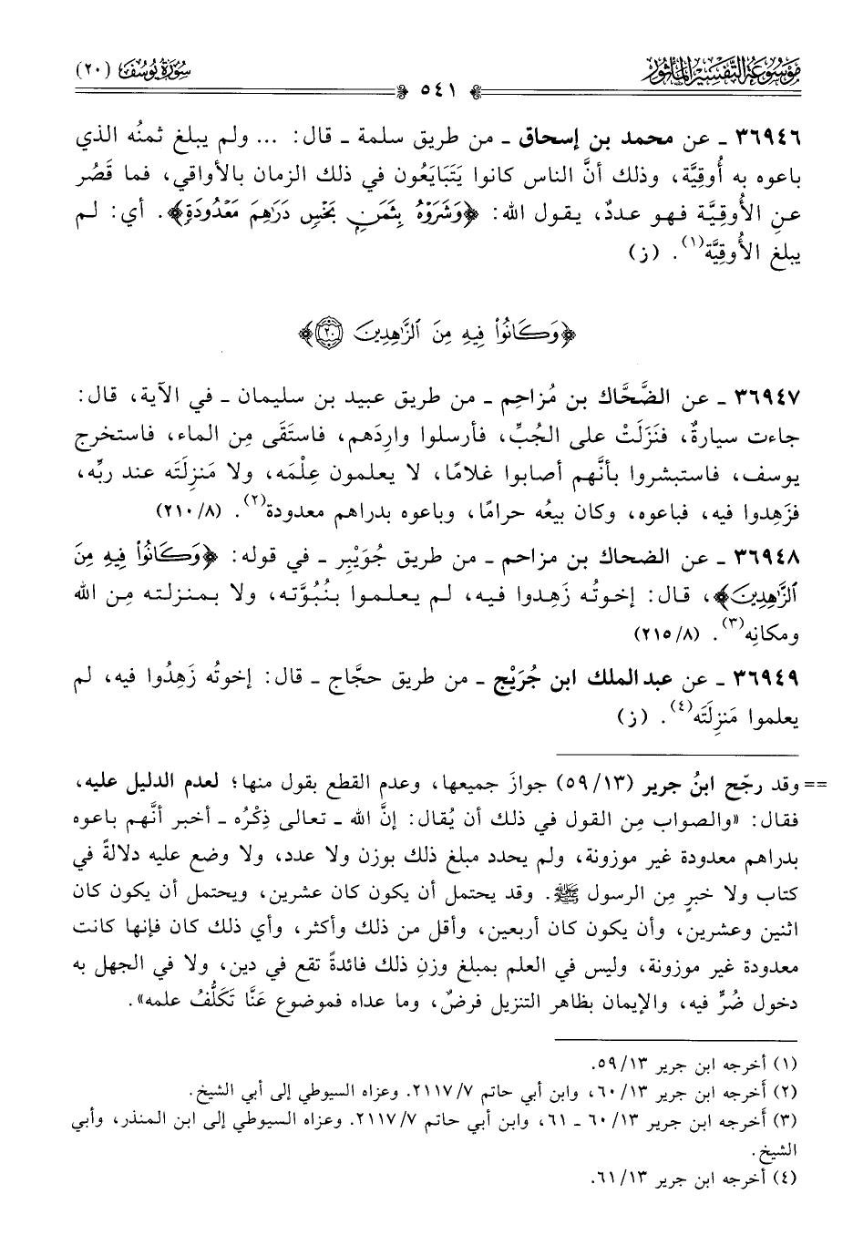 ٣٦٩٤٨ - عن الضحاك بن مزاحم -من طريق جُوَيْبِر- في قوله: {وكانوا فيه من الزاهدين}، قال: إخوتُه زَهِدوا فيه، لم يعلموا بنُبُوَّته، ولا بمنزلته مِن الله ومكانِه (¬٣). (٨/ ٢١٥)