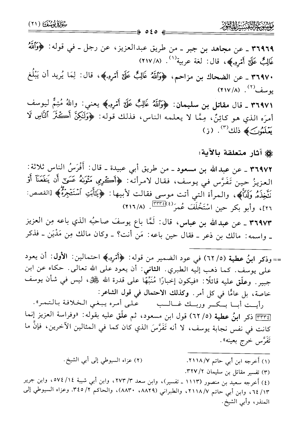 [٣٣٣٤] ذكر ابنُ عطية (٥/ ٦٢) قول ابن مسعود، ثم علّق عليه بقوله: «وفراسة العزيز إنما كانت في نفس نجابة يوسف، لا أنه تَفَرَّسَ الذي كان كما في المثالين الآخرين، فإنّ ما تَفَرَّس خرج بعينه».