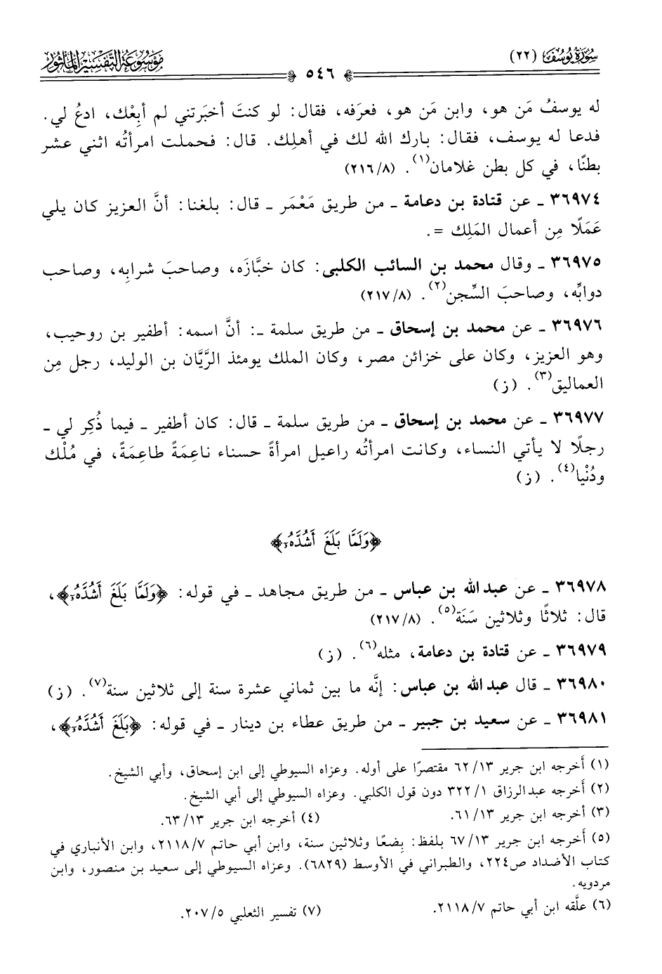 ٣٦٩٧٨ - عن عبد الله بن عباس -من طريق مجاهد- في قوله: {ولما بلغ أشده}، قال: ثلاثًا وثلاثين سَنَة (¬٥). (٨/ ٢١٧)