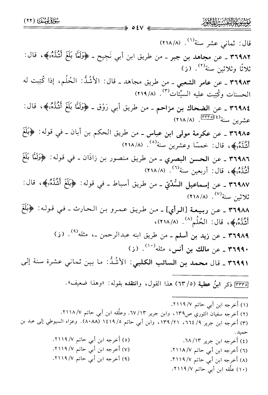 ٣٦٩٨٥ - عن عكرمة مولى ابن عباس -من طريق الحكم بن أبان- في قوله: {بلغ أشده}، قال: خمسًا وعشرين سنة (¬٥).