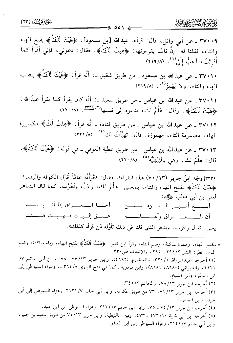 ٣٧٠١١ - عن عبد الله بن عباس -من طريق سعيد- أنّه كان يقرأ كما يقرأ عبدُ الله: {هَيْتَ لَكَ}. وقال: هَلُمَّ لك، تدعوه إلى نفسها (¬٣) [٣٣٣٩]. (٨/ ٢٢٠)