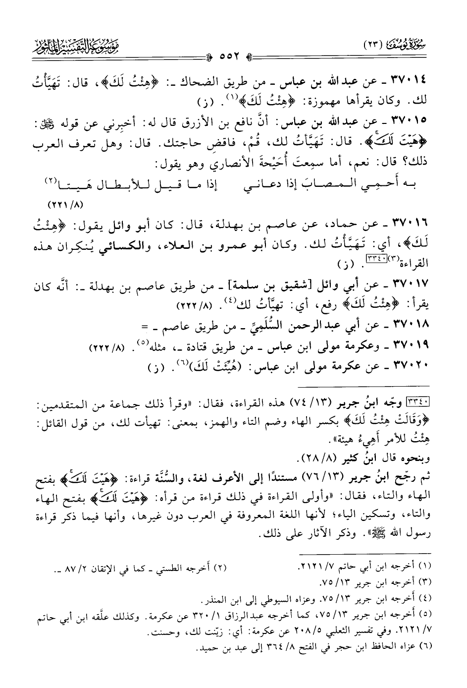 ٣٧٠١٤ - عن عبد الله بن عباس -من طريق الضحاك-: «هِئْتُ لَكَ»، قال: تَهَيَّأْتُ لك. وكان يقرأها مهموزة: «هِئْتُ لَكَ» (¬١). (ز)
