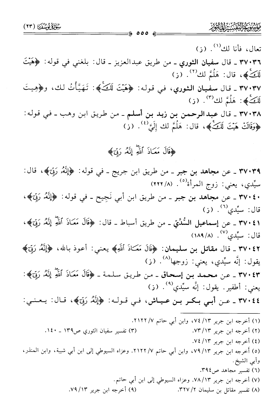 ٣٧٠٣٩ - عن مجاهد بن جبر -من طريق ابن جريج- في قوله: {إنه ربي}، قال: سيِّدي، يعني: زوج المرأة (¬٥). (٨/ ٢٢٢)