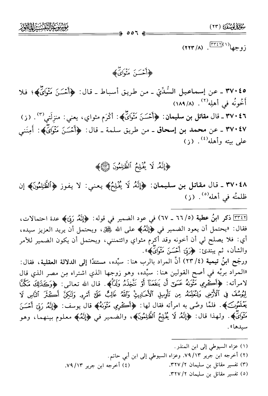 ٣٧٠٤٥ - عن إسماعيل السُّدِّيّ -من طريق أسباط- قال: {أحسن مثواى}؛ فلا أخُونُه في أهلِه (¬٢). (٨/ ١٨٩)