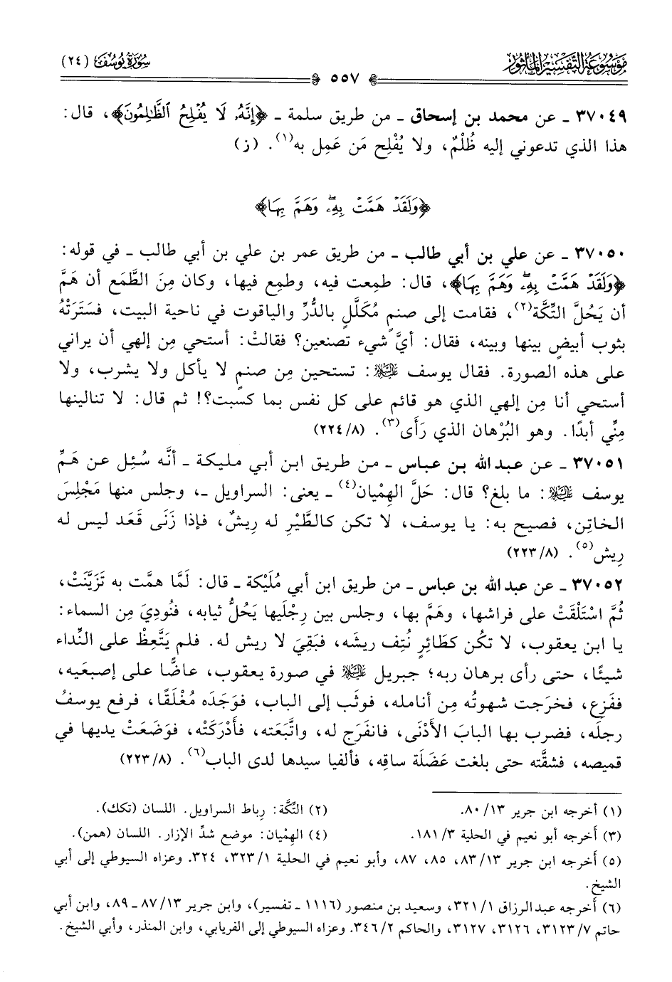 ٣٧٠٥٠ - عن علي بن أبى طالب -من طريق عمر بن علي بن أبي طالب- في قوله: {ولقد همت به وهم بها}، قال: طمِعت فيه، وطمِع فيها، وكان مِنَ الطَّمَع أن هَمَّ أن يَحُلَّ التِّكَّة (¬٢)، فقامت إلى صنمٍ مُكَلَّلٍ بالدُّرِّ والياقوت في ناحية البيت، فسَتَرَتْهُ بثوب أبيضٍ بينها وبينه، فقال: أيَّ شيء تصنعين؟ فقالتْ: أستحي مِن إلهي أن يراني على هذه الصورة. فقال يوسف - عليه السلام -: تستحين مِن صنمٍ لا يأكل ولا يشرب، ولا أستحي أنا مِن إلهي الذي هو قائم على كل نفس بما كسبت؟! ثم قال: لا تنالينها مِنِّي أبدًا. وهو البُرْهان الذي رَأى (¬٣). (٨/ ٢٢٤)