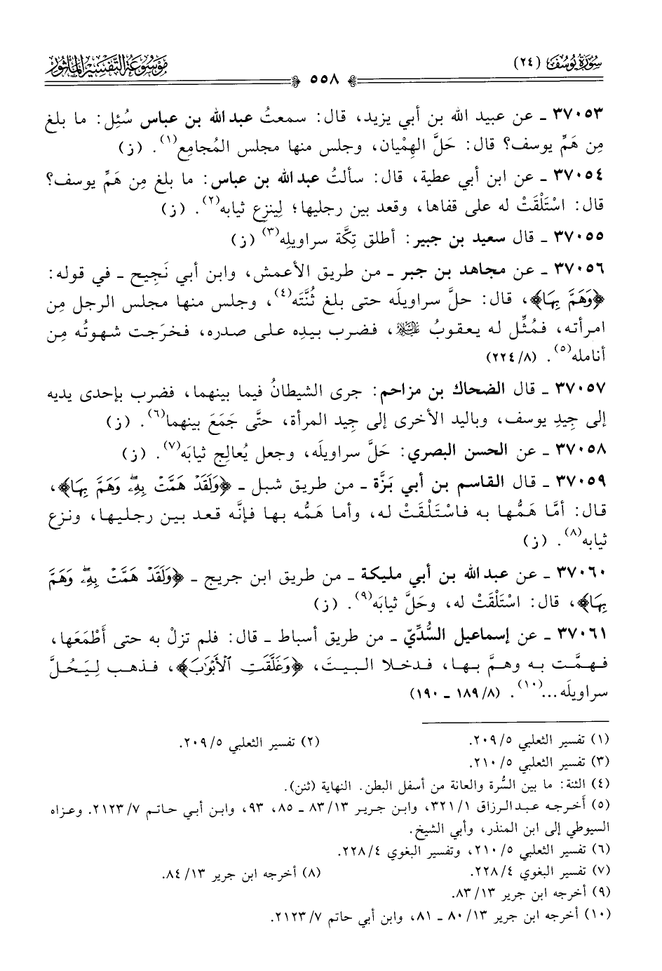 ٣٧٠٦١ - عن إسماعيل السُّدِّيّ -من طريق أسباط- قال: فلم تزلْ به حتى أطْمَعَها، فهمَّت به وهمَّ بها، فدخلا البيتَ، {وغلقت الأبواب}، فذهب لِيَحُلَّ سراويلَه ... (¬١٠). (٨/ ١٨٩ - ١٩٠)