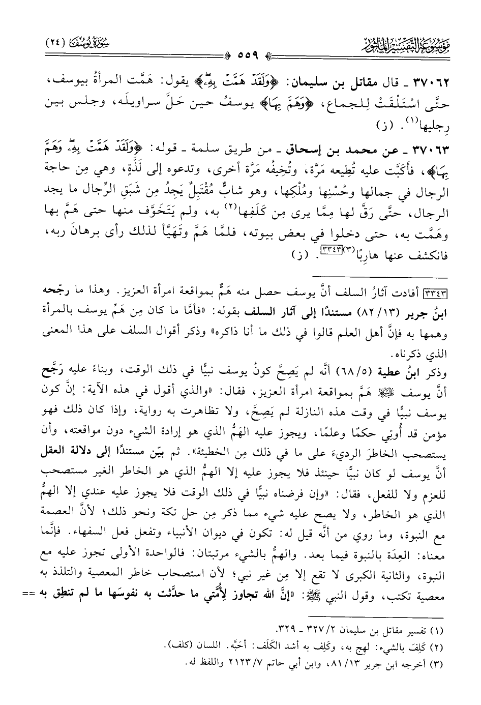 [٣٣٤٣] أفادت آثارُ السلف أنّ يوسف حصل منه هَمُّ بمواقعة امرأة العزيز. وهذا ما رجّحه ابنُ جرير (١٣/ ٨٢) مستندًا إلى آثار السلف بقوله: «فأمّا ما كان مِن هَمِّ يوسف بالمرأة وهمها به فإنّ أهل العلم قالوا في ذلك ما أنا ذاكره» وذكر أقوال السلف على هذا المعنى الذي ذكرناه.