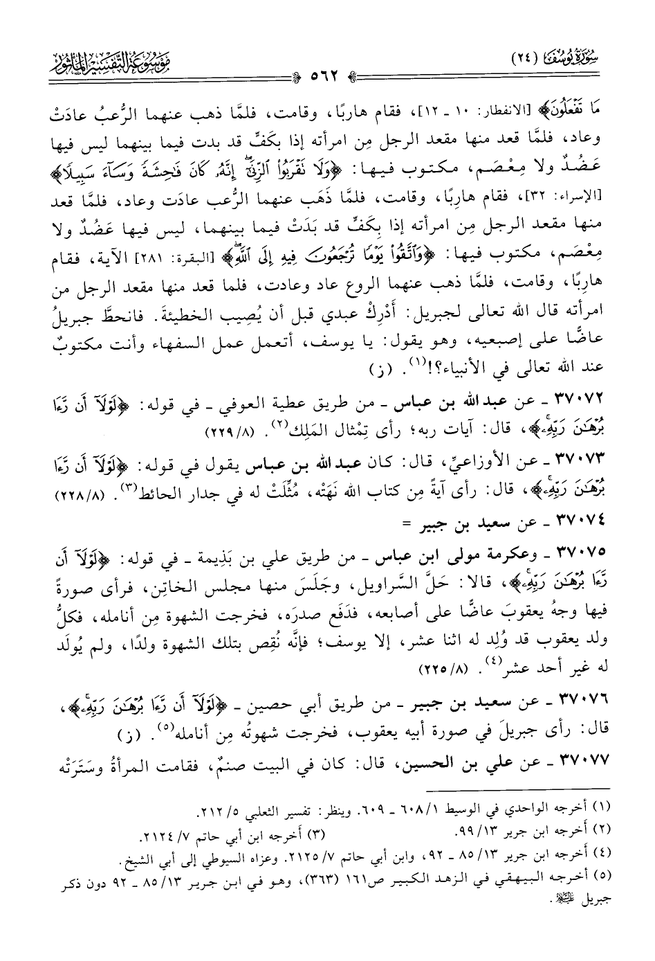 ٣٧٠٧٢ - عن عبد الله بن عباس -من طريق عطية العوفي- في قوله: {لولا أن رءا برهان ربه}، قال: آيات ربه؛ رأى تِمْثال المَلِك (¬٢). (٨/ ٢٢٩)