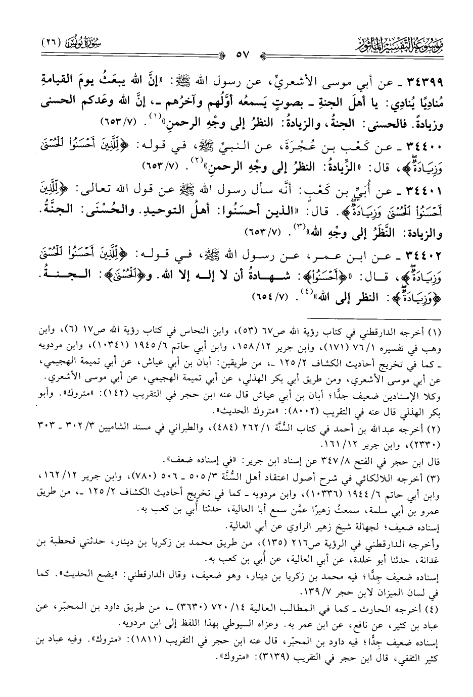 ٣٤٤٠٢ - عن ابن عمر، عن رسول الله - صلى الله عليه وسلم -، في قوله: {لِلَّذِينَ أحْسَنُوا الحُسْنى وزِيادَةٌ}، قال: «{أحسَنوا}: شهادةُ أن لا إله إلا الله. و {الحسنى}: الجنةُ. و {زيادةٌ}: النظر إلى الله» (¬٤). (٧/ ٦٥٤)