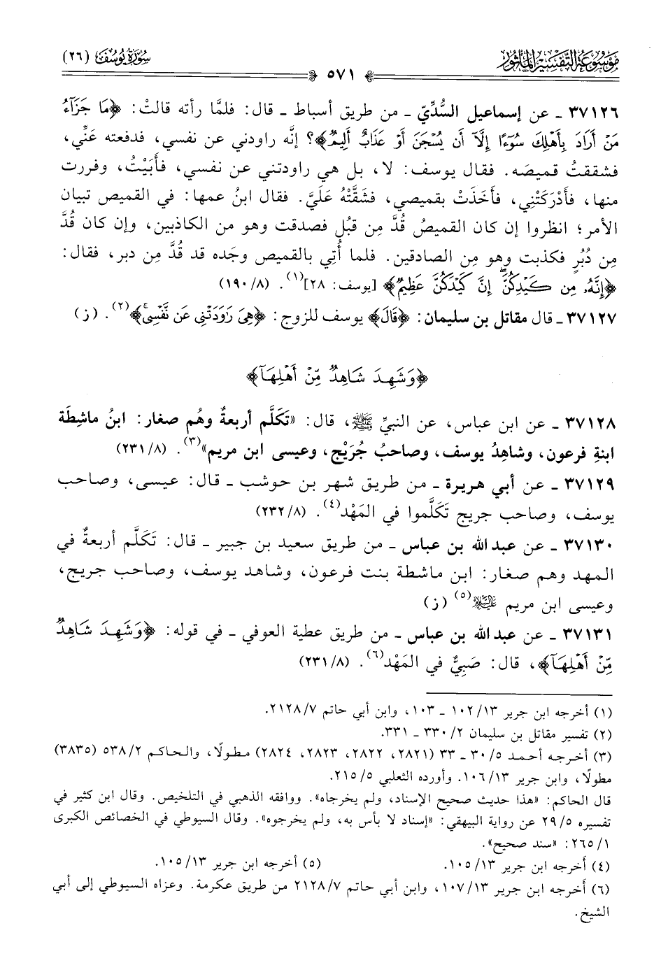 ٣٧١٣٠ - عن عبد الله بن عباس -من طريق سعيد بن جبير- قال: تَكَلَّم أربعةٌ في المهد وهم صغار: ابن ماشطة بنت فرعون، وشاهد يوسف، وصاحب جريج، وعيسى ابن مريم - عليه السلام - (¬٥). (ز)