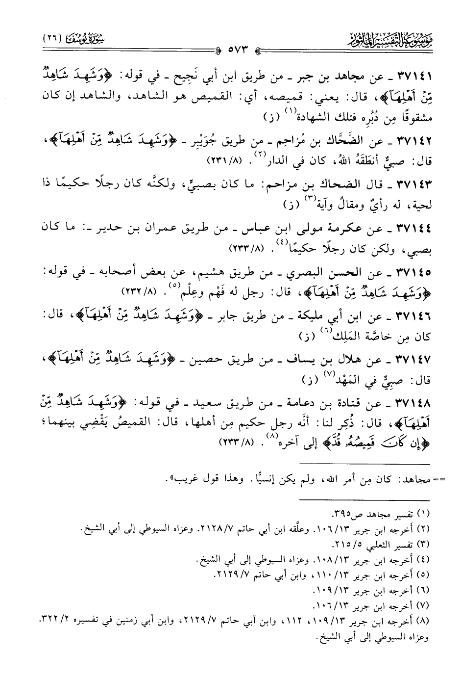 ٣٧١٤٧ - عن هلال بن يساف -من طريق حصين- {وشهد شاهد من أهلها}، قال: صبِيٌّ في المَهْد (¬٧). (ز)